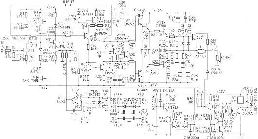 V4、VR和R9接在V3、V5集電極之間構成Vbe擴大電,調節VR可改變末級大功率管的靜態工作電流。V4還起度補償作用,當功率管的溫度升高時,V4的發射結壓降小,于是V4的集電極一發射極電壓也降低,從而降低了功管的靜態電流,作用與二極管相似,但比二極管更靈,安裝時應與功率管一起裝在散熱器上,電氣上要絕。