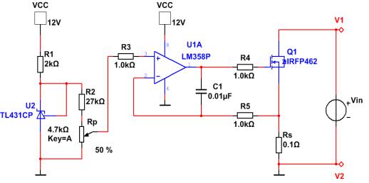 基本原理:MOS和電阻Rs組成負反饋電路,MOS管工作在恒流區,運放同相端調節設定恒流值,MOS管的電流在電阻Rs上產生壓降,反饋到運放反向端實現控制輸出電流。R1、U2構成一2.5V基準電壓源,R2、Rp對這2.5V電壓分壓得到一參考電壓送入運放同相端,MOS管輸出回路的電流Is經Rs轉換成電壓后,反饋到運放反向端實現控制vgs,從而控制MOS管輸出回路的電流Is的穩定。電容C1主要作用有2個,一方面是消雜波,另一方面也是對運放輸出的梯波進行補償,使得電壓變化速度減緩,盡量減少mosfet的G極電壓高頻變化引發振蕩的可能。