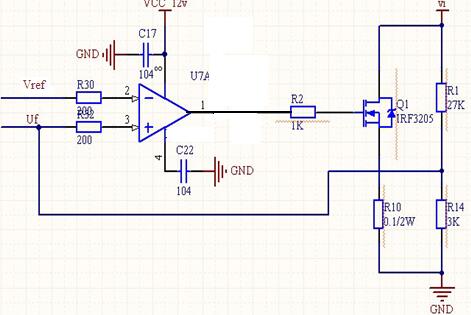 當Uf>Vref時,運放加大輸出,MOS管導通程度加深,使得MOS管輸出回路上的電壓下降;