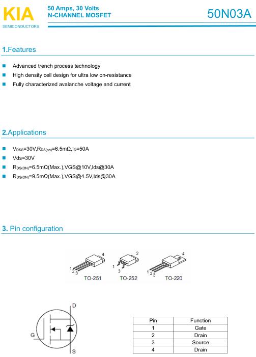 安定器MOS管 50N03 50A/30V規格書-防反接產品 12V輸入方案-KIA MOS管