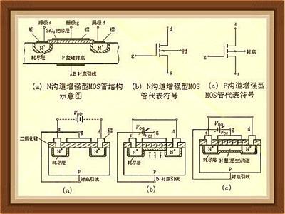 在一塊摻雜濃度較低的P型硅襯底上,制造兩個高摻雜濃度的N+區(qū),并用金屬鋁引出兩個電極,別離作漏極d和源極s。然后在半導(dǎo)體外表掩蓋一層很薄的二氧化硅(SiO2)絕緣層,在漏——源極間的絕緣層上再裝上一個鋁電極,作為柵極g。在襯底上也引出一個電極B,這就構(gòu)成了一個N溝道增強型MOS管。MOS管的源極和襯底通常是接在一同的(大多數(shù)管子在出廠前已聯(lián)接好)。它的柵極與其它電極間是絕緣的。圖(a)、(b)別離是它的構(gòu)造示意圖和代表符號。代表符號中的箭頭方向標(biāo)明由P(襯底)指向N(溝道)。P溝道增強型MOS管的箭頭方向與上述相反,如圖(c)所示。