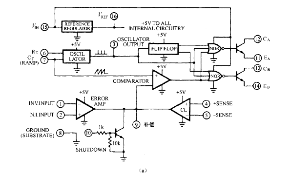 在圖 9.7 C b ) 中,變壓器初級連接到 PWM 芯片的 11 腳和 14 腳。在半周期的導通時間 內,11 腳相對于 14 腳為正 ,并輸出 200mA 電流。11 腳電位對地約為 +(Vh 2)V, 14 腳電位 對地約為+2V 。在半周期的死區(qū)時間內 ,11 腳和 14 腳都對地短路 。在下半周期 ,11 腳和 14 腳的極性顛倒 。若初級電壓為士 lOV ,則供電電壓 vh 應約為 14V。