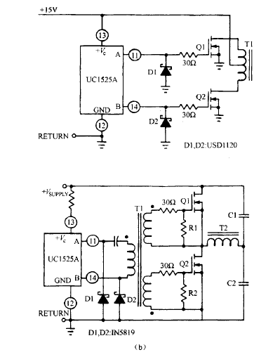 第二代 PWM 芯片,如 Unitrode 公司生產的 UC1525A[坷 ,具有內置圖騰柱結構 ,它由 NPN 型反相器疊加 NPN 型射極跟隨器組成 。如圖 9.7 ( a ) 所示,射極跟隨器和反相器由相 位相差 180。的信號驅動,交錯導通。通過使用具有兩個互相隔離的次級的變壓器( 圖 9.7( b) ) 驅動具有不同直流電壓水平的半橋或全橋電路的上 F兩只晶體管。類似地 ,推挽電路也可以 驅動具有相同直流電壓的 MOSFET 管。
