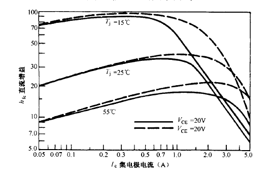 對(duì)于MOS管雙極型晶體管 ,由于電流增益隨輸出電流的上升急劇下降 ,當(dāng)輸出電流顯著增加時(shí), 其基極電流的增加是無法接受的 ,所以最大輸出電流受到限制 。圖 9.13 給出了 2N6542 雙極型晶體管 (SA、400V )電流增益與集電極電流的關(guān)系曲線 。