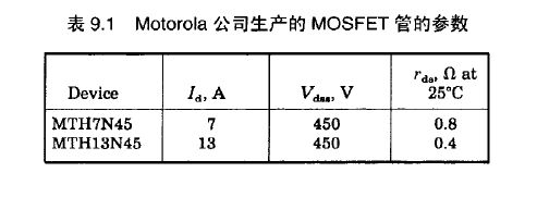 表 9.1 給出了 Motorola 公司生產(chǎn)的塑料封裝 、額定電壓為 450V 的 MOSFET 管的各種 數(shù)據(jù)。