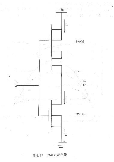 如圖6. 28所示,CMOS反相器為CMOS邏輯電路的基本單元.在CMOS反相器中,p與n溝道晶體管的柵極銜接在一同,并作為此反相器的輸入端,而此二晶體管的漏極也連接在一同,并作為反相器的輸出端.n溝道MOSFET的源極與襯底接點(diǎn)均接地,而p溝道MOSFET的源極與襯底則銜接至電源供應(yīng)端(VDD),需留意的是p溝道與n溝道MOSFET均為增強(qiáng)型晶體管,當(dāng)輸入電壓為低電壓時(shí)(即vin=O,VGsn=o
