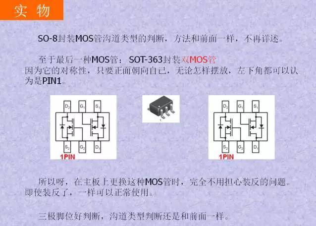 目前主板或顯卡上所采用的MOS管并不是太多,一般有10個左右,主要原因是大部分MOS管被整合到IC芯片中去了。由于MOS管主要是為配件提供穩定的電壓,所以它一般使用在CPU、AGP插槽和內存插槽附近。其中在CPU與AGP插槽附近各安排一組MOS管,而內存插槽則共用了一組MOS管,MOS管一般是以兩個組成一組的形式出現主板上的。
