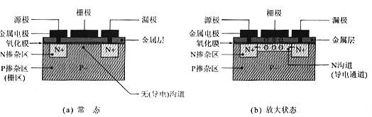 在常態下,MOSFET中并沒有導電通道,在有了偏置電壓時,在電場的作用下,源極(區)與柵極(區)之間就會形成導電通道,并且隨著偏置電壓的增加而加寬,導電能力增加直到最大(飽和導通)。這種MOSFET稱為增強型MOS管(Enhancement-Mode MOSFET),這是目前為止應用最為廣泛的MOSFET,尤其是功率MOSFET和CMOS IC。PMOS和NMOS -般也是指增強型的MOSFET。