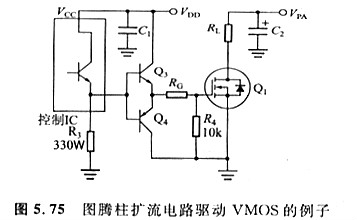 圖騰柱屬于推挽電路,因而能夠主動(dòng)對(duì)VMOS的柵極停止放電,這樣一來,柵極泄放電阻能夠省略,也能夠取比擬大的數(shù)值,以防萬一。假如IC內(nèi)部的驅(qū)動(dòng)才能缺乏,外部能夠增加擴(kuò)流電路,常見的電路方式也是圖騰柱的電路。關(guān)于集電極開路輸出的IC,如TTL集成電路,外接擴(kuò)流電路時(shí),通常并不從集電極取信號(hào),而是從發(fā)射極取信號(hào)(圖5. 75),這樣—來,內(nèi)部的集電極開路輸出級(jí)就變成了射極跟隨器,既降低了輸出阻抗,也有利于開關(guān)速度的進(jìn)步。