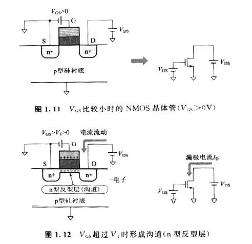 當柵極—源極間的電壓VGS從0V逐步增加時(圖1.11),那么在一定電壓下,如圖1. 12所示,在柵氧化膜下面會構成稱為溝道的n型化的區域,即構成n型反型層。這個溝道就是將源區與漏區l連接起來的電子通路。這時如圖1.12所示,當漏極加電壓VDS時,漏極—源極間就有電流流過,該電流叫做漏極電流。把構成溝道所必需的柵極—源極間的電壓叫做閾值電壓VT,關于Si MOS晶體管來說,大約是0.6V。用VTN、VTP分別表示NMOS晶體管和PMOS晶體管的闞值電壓。柵極—源極間所加電壓VGS高于閾值電壓VT構成溝道的狀態稱為強反型狀態(strong inversion)。