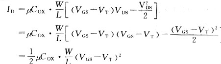 在VGS大于VT的強反型狀態,假如漏極-源極電壓進一步增加,到達VDS=VGS-VT時,漏極電流ID就變為下式: