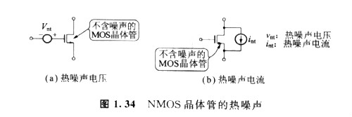 如圖1. 34(a)所示,MOS晶體管的熱噪聲可以用不含熱噪聲的MOS晶體管以及與柵極連接的電壓源束表示。這時(shí),強(qiáng)反型的飽和區(qū)中MOS晶體管的熱噪聲