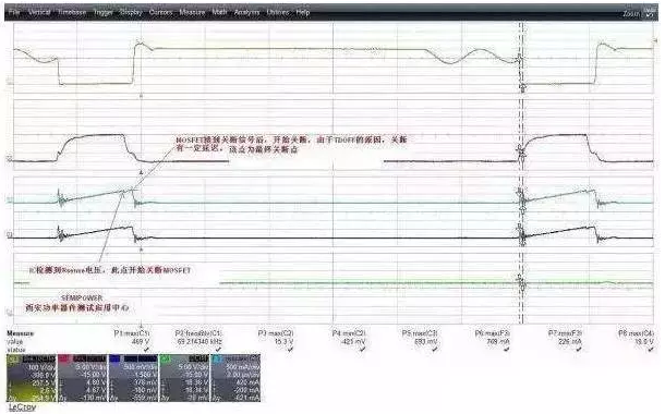 從圖中可以看出,電流波形在快到電流尖峰時,有個下跌,這個下跌點后又有一段的上升時間,這段時間其本質就是IC在檢測到過流信號執行關斷后,MOSFET本身也開始執行關斷,但是由于器件本身的關斷延遲,因此電流會有個二次上升平臺,如果二次上升平臺過大,那么在變壓器余量設計不足時,就極有可能產生磁飽和的一個電流沖擊或者電流超器件規格的一個失效。