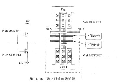 CMOS中,由于閂鎖現象/可控硅現象的緣由,需求思索設置恰當的別離寄生雙極晶體管的稱為防護帶(圖10. 16)的別離墻/過渡電流吸收帶。不過對集成度的影響不大。最近,還開發出不需求防護帶的制造技術。而且,由于CMOS的低功耗特性,在發熱問題上比雙極器件優越,也有利于集成化。