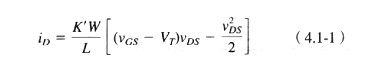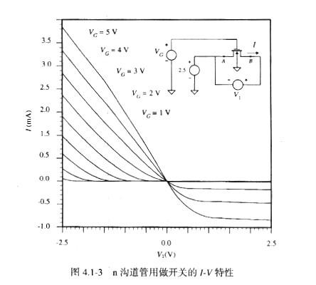 式(4.1-2)中的Q是晶體管的靜態(tài)工作點(diǎn)。圖4.1-3說明了n溝道管漏極電流隨漏、源電壓變化的曲線,其巾管子的寬長比WIL=5/1,VGS等間隔增加。此圖說明了MOS管下作的一些重要原理。注意,圖中的曲線并不是關(guān)于Vl=0對稱的。這是因?yàn)榫w管端(漏、源)開關(guān)起著Vl過零的轉(zhuǎn)換作用。例如,當(dāng)VI為正時(shí),B點(diǎn)是漏極,A點(diǎn)為源極,且VBS同定為-2.5V,VGS由給定的VG固定。當(dāng)V1為負(fù)時(shí),B點(diǎn)為源極,A點(diǎn)為漏極,且VI和VBS連續(xù)減少,而VGS增加,從而導(dǎo)致電流增加。