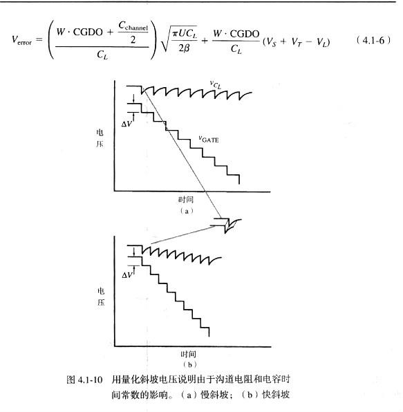 這個(gè)例子說明了電荷饋通模型的應(yīng)用。讀者應(yīng)該得到警示,不要期望從式(4.1-3)到式(4.1-8)得到實(shí)際電路中關(guān)于電荷饋通量的精確答案。這個(gè)模型只是有助于了解各種電路元件和端口條件的影響,以便在最小化設(shè)計(jì)中出現(xiàn)不希望有的現(xiàn)象。