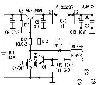 1.初始狀態:電路初始狀態下,開關S1沒有被按下,三極管Q2的基極為高電平,處于截止狀態,電源轉換芯片6203沒有電源輸入,也就沒有3.3V的電源輸出。三極管Q1也處于截止狀態。