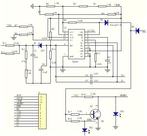 輸出脈沖的寬度是通過(guò)電容CT上的正極性鋸齒波電壓與另外兩個(gè)控制信號(hào)進(jìn)行比較來(lái)實(shí)現(xiàn)。功率輸出管Q1和Q2受控于或非門。當(dāng)雙穩(wěn)觸發(fā)器的時(shí)鐘信號(hào)為低電平時(shí)才會(huì)被選通,即只有在鋸齒波電壓大于控制信號(hào)期間才會(huì)被選通。當(dāng)控制信號(hào)增大,輸出脈沖的寬度將減小。(7)腳接地端,(8)、(11)腳是Q1和Q2內(nèi)部開關(guān)管的集電極,在此電路中接電源,(9)、(10)腳為Q1、Q2的發(fā)射極,作開關(guān)管驅(qū)動(dòng)輸出端,接下圖中Q1與Q2外部放大電路。以驅(qū)動(dòng)后極推挽電路。(12)腳電源端,(13)腳為輸出控制端,接(14)腳基準(zhǔn)電壓時(shí)兩路輸出脈沖相差180方位,每路輸出量大約200MA的驅(qū)動(dòng)推挽或半橋式電路。(15)、腳第二組放大器的反相輸入端,接基準(zhǔn)電壓, (16)腳同相輸入端,檢測(cè)電源電壓。當(dāng)電壓過(guò)高超過(guò)(15)腳參考電壓時(shí),(3)腳輸出高電平,電路進(jìn)入保護(hù)狀態(tài)。