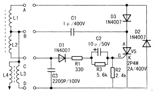 其工作原理是L1產(chǎn)生交流電壓經(jīng)D3整流向C1充電,控制線圈L2電流經(jīng)D1整流,再經(jīng)R1、R2、R3限流分壓后觸發(fā)可控硅導(dǎo)通,電流經(jīng)L3并在L4上產(chǎn)生高壓完成點(diǎn)火。