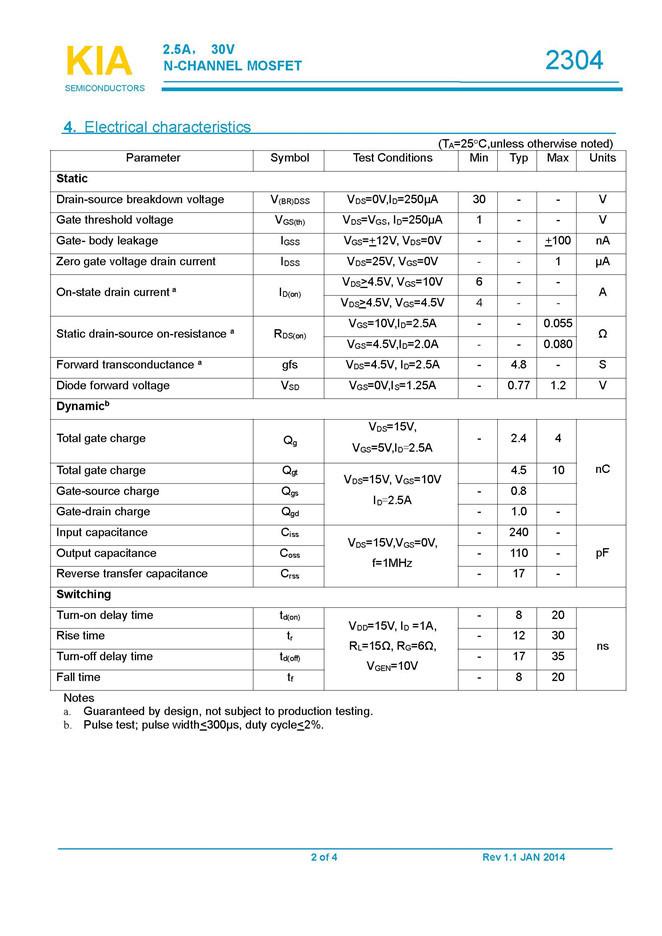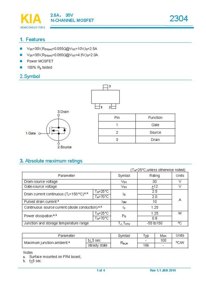 參數: ID(A): 2.5 BVDSS(V): 30 RDS(ON): 0.08 Qg(nC): 4 Package: SOT-23
