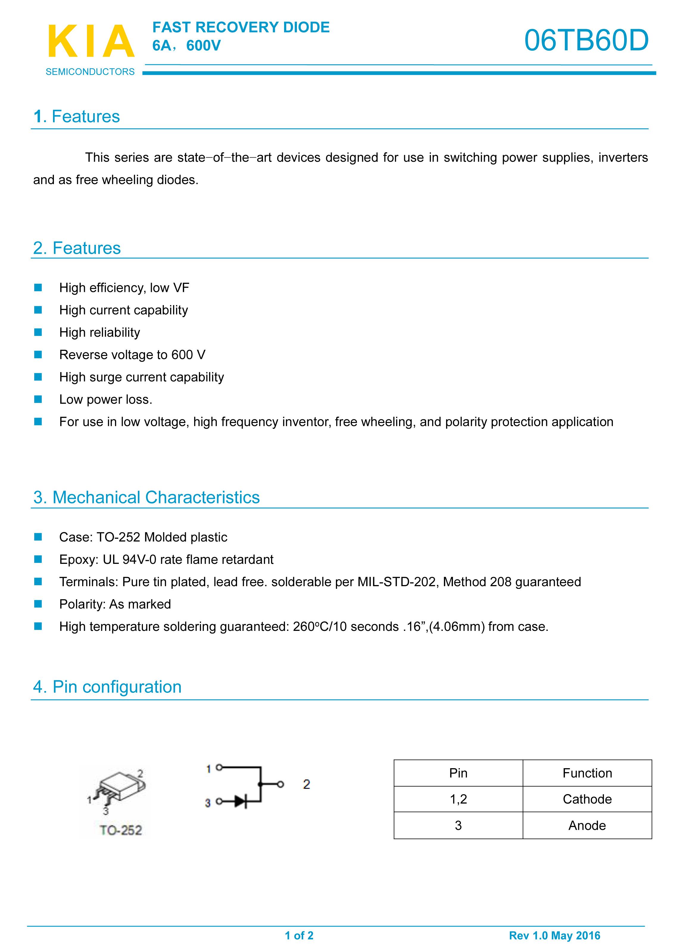 參數: VR(V): 600V    IF(A): 6A    Trr(ns): 25NS    Package: TO-252