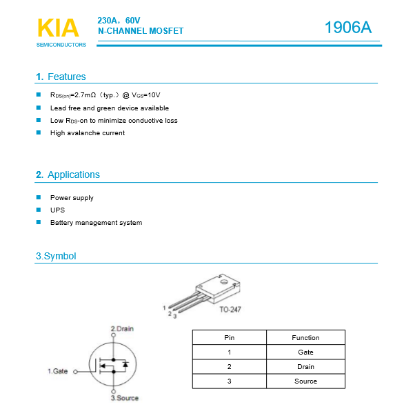 參數: ID(A): 230 BVDSS(V): 60 RDS(ON): 0.0027 Qg(nC): 172 Package: TO-247