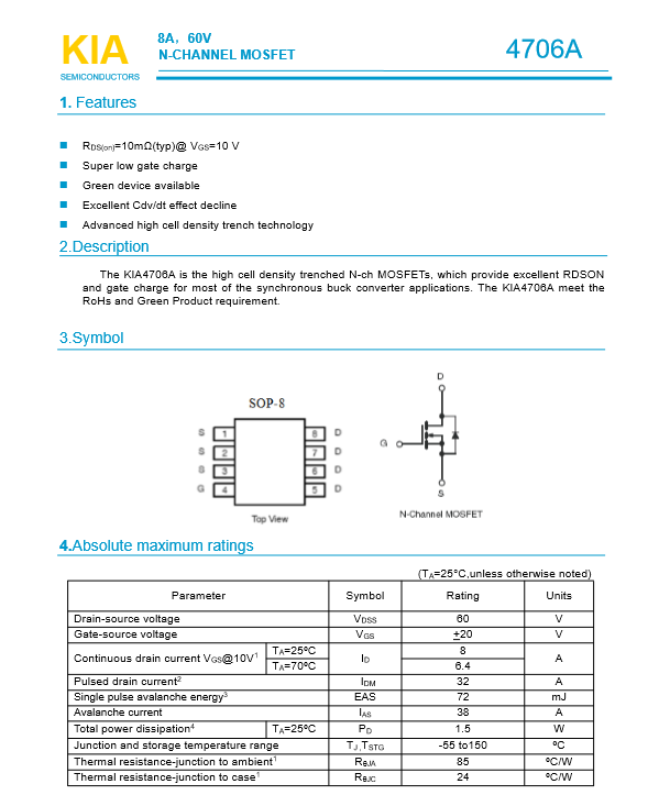 參數: ID(A): 8 BVDSS(V): 60 RDS(ON): 0.01 Qg(nC): 30 Package: sop-8