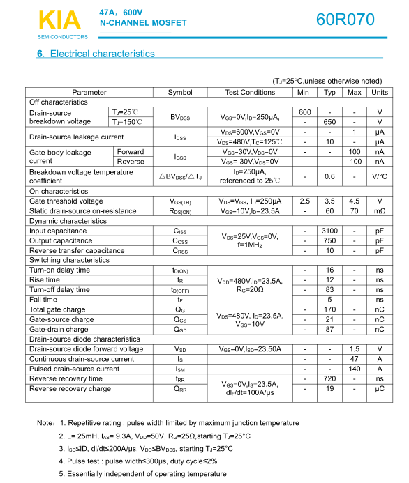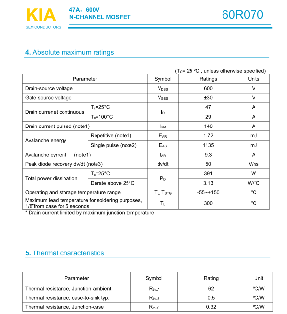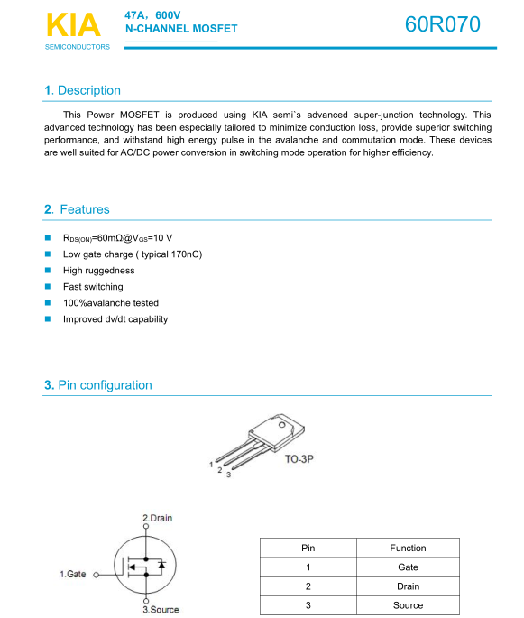 參數: ID(A): 47 BVDSS(V): 600 RDS(ON): 0.06 Qg(nC): 170 Package: TO-3P