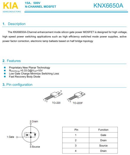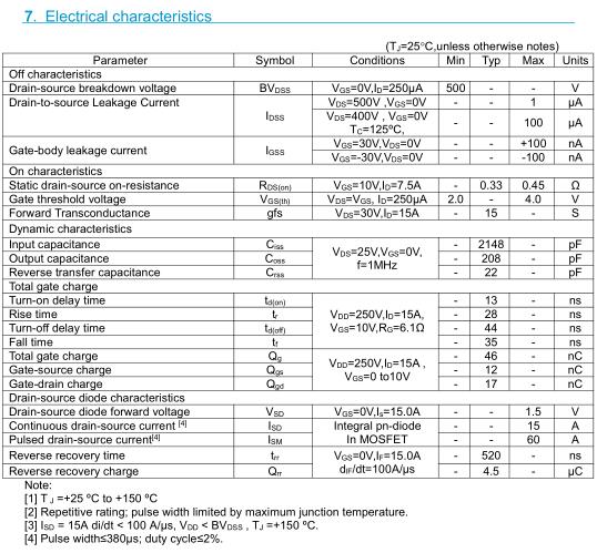 參數: ID(A): 15 BVDSS(V): 500 RDS(ON): 0.33 Qg(nC): 46 Package: TO-220F
