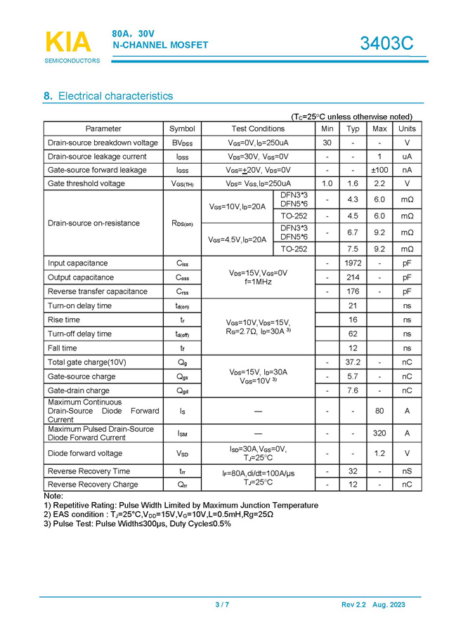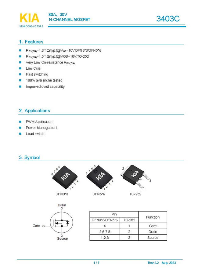 參數: ID(A): 80    BVDSS(V): 30    RDS(ON): 4.3    Qg(nC): 37.2    Package: TO-252.DFN3*3.DFN5*6