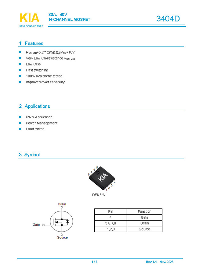 參數: ID(A): 80    BVDSS(V): 40    RDS(ON): 5.2    Qg(nC): 58    Package: DFN5*6