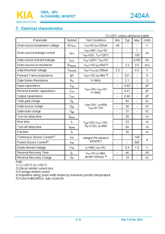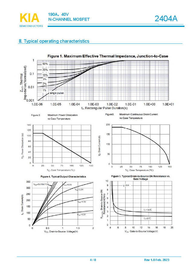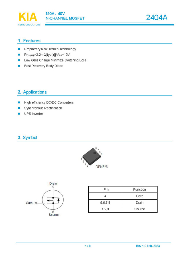 參數: ID(A): 190 BVDSS(V): 40 RDS(ON): 2.2 Qg(nC): 94 Package: DFN5*6