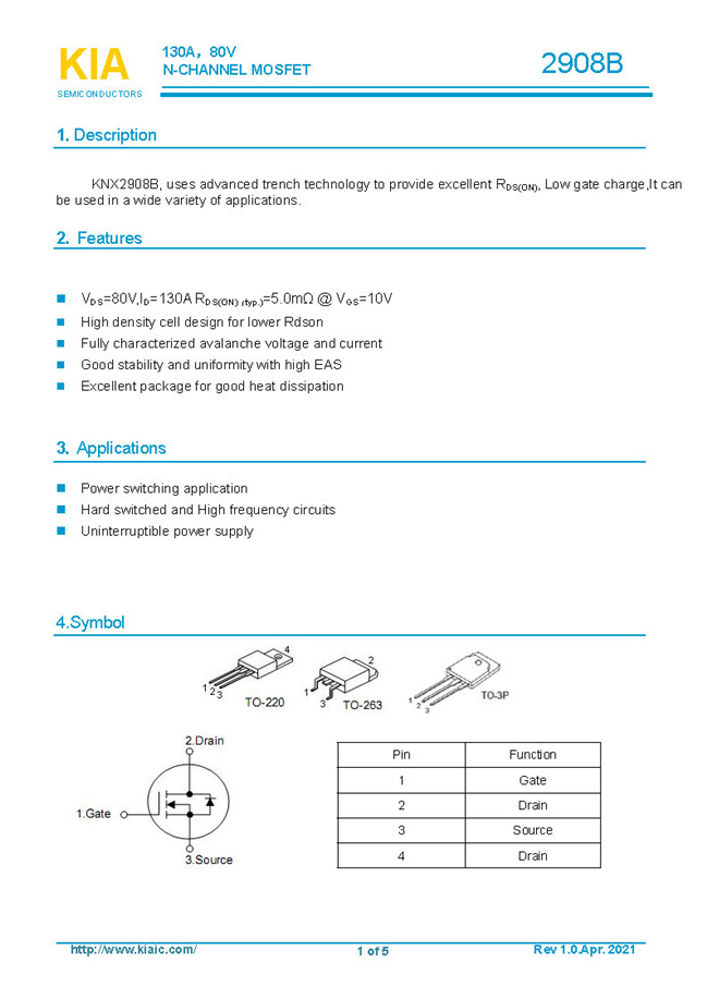參數(shù): ID(A): 130 BVDSS(V): 80 RDS(ON): 5.0mΩ Qg(nC): 160 Package: TO-220.263.3P
