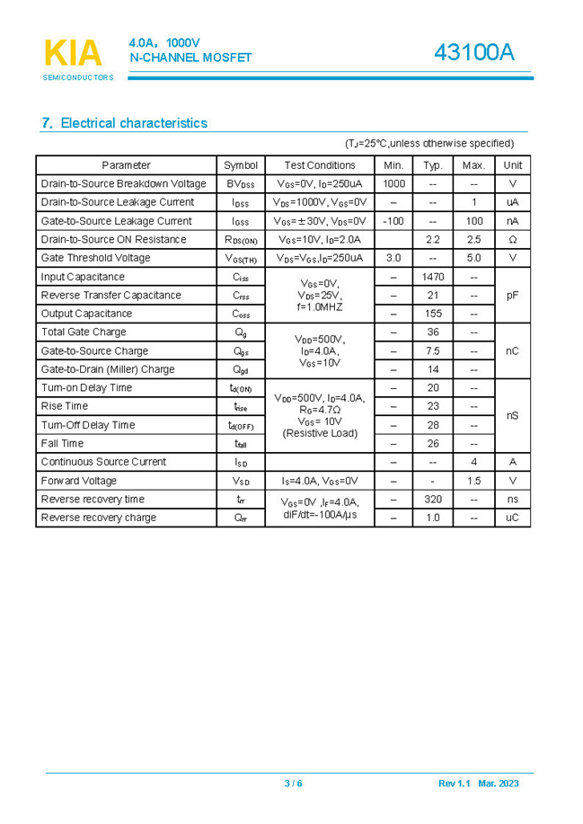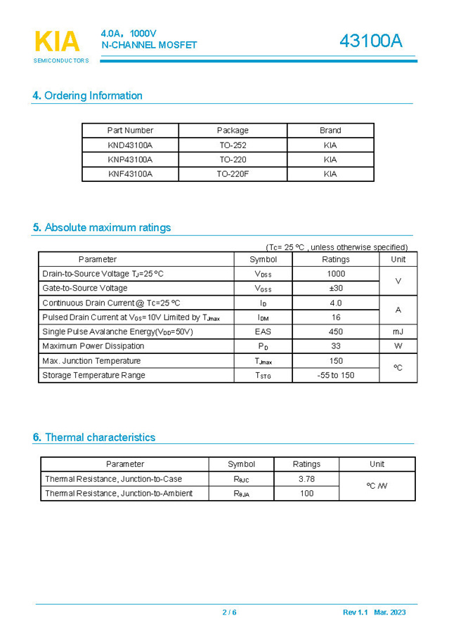 參數: ID(A): 4 BVDSS(V): 1000 RDS(ON): 2.2Ω Qg(nC): 36 Package: TO-252.TO-220.TO-220F