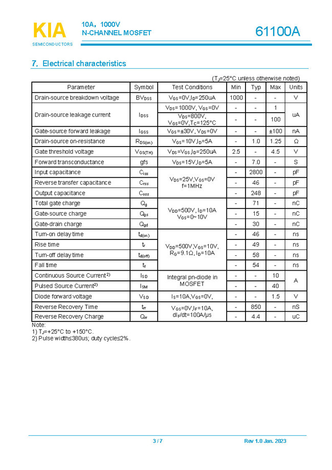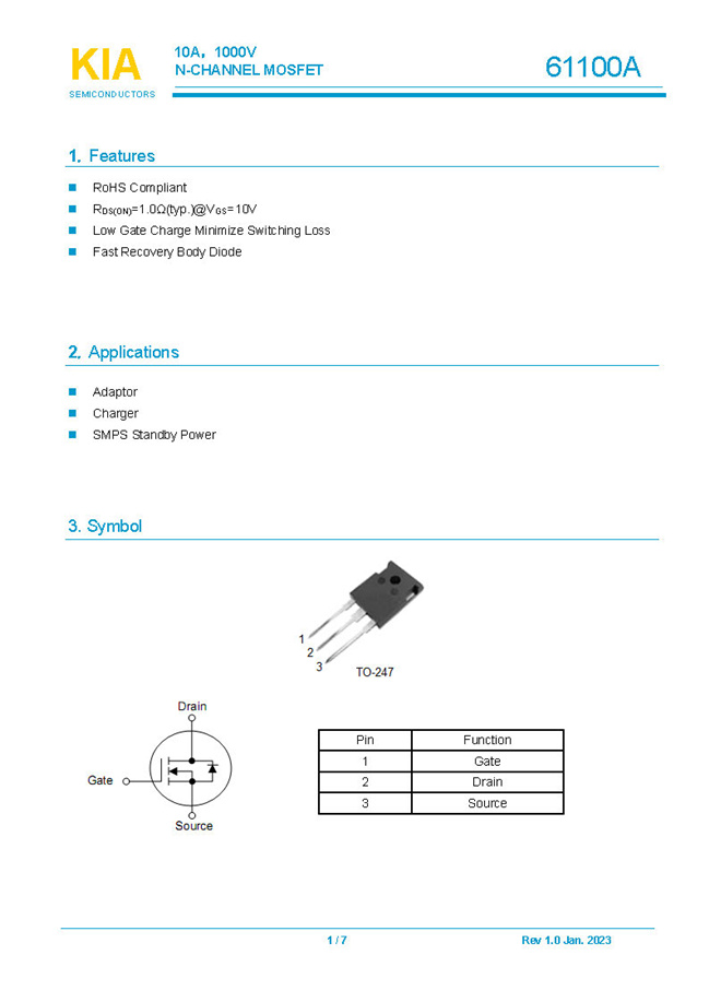 參數: ID(A): 10 BVDSS(V): 1000 RDS(ON): 1.0Ω Qg(nC): 71 Package: TO-247