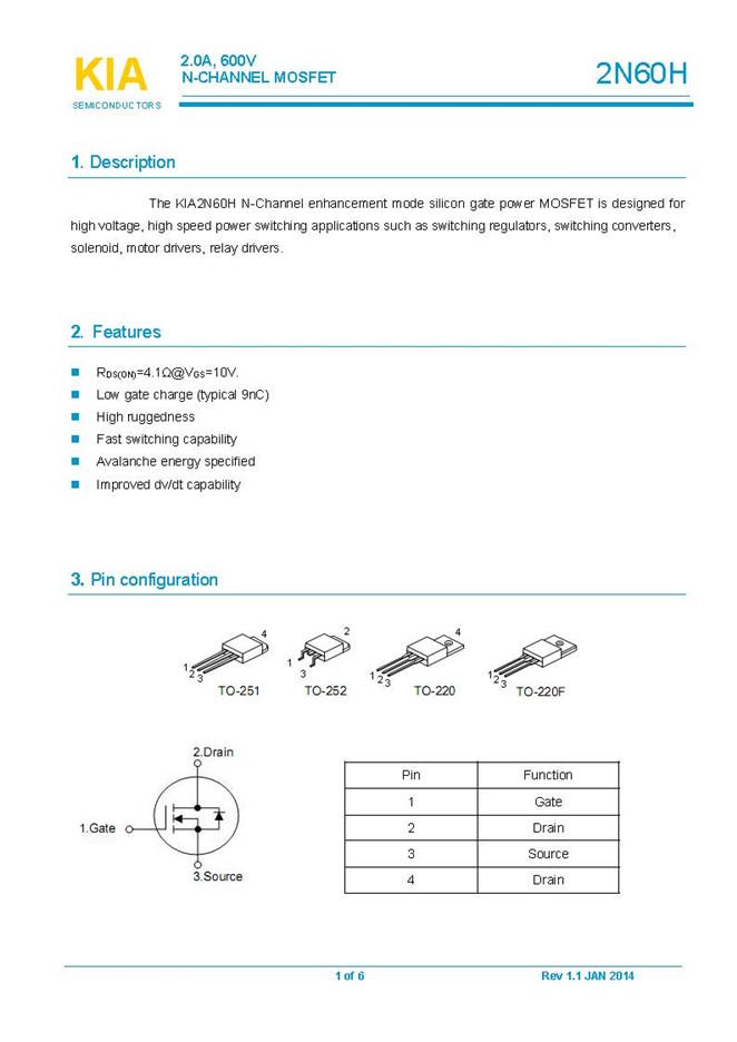 參數: ID(A): 2    BVDSS(V): 600    RDS(ON): 5    Qg(nC): 9    Package: TO-251、TO-252、TO-220、TO-220F